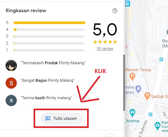 - Cari Tempat Menulis Ulasan, Saat anda melihat tempat yang akan anda ulas, Anda akan melihat Rating dan jumlah ulasan yang telah dituli pengguna lain. Kemudian, Klik Tombol Buat Ulasan.